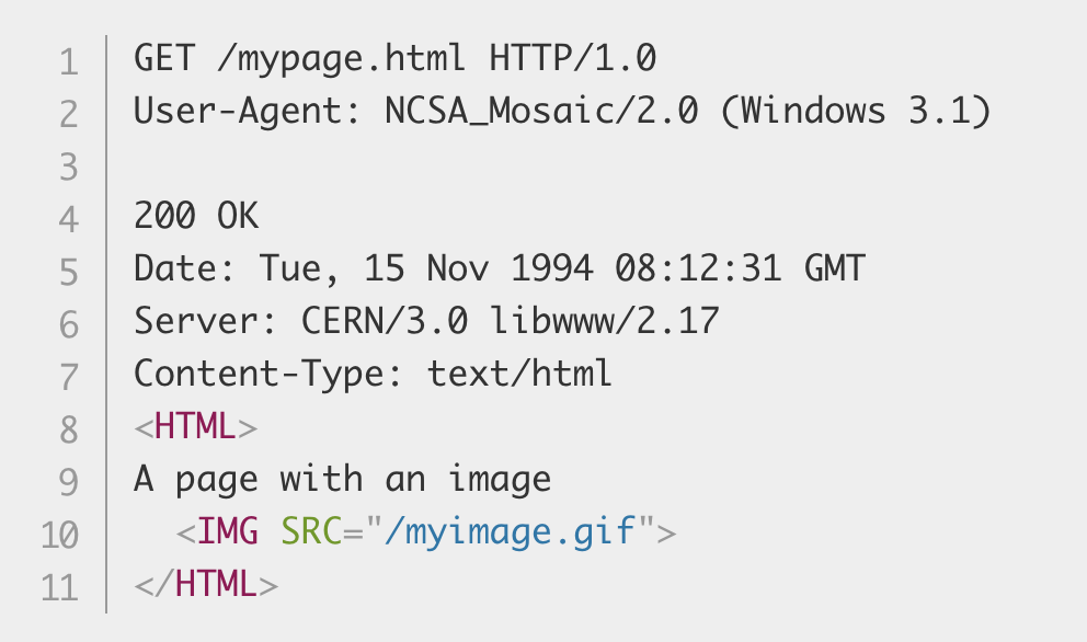 <html> 단순한 페이지만 전송 가능 </html>물론 지금은 익숙한 상태코드(status code), 헤더 등의 정보도 없었습니다.