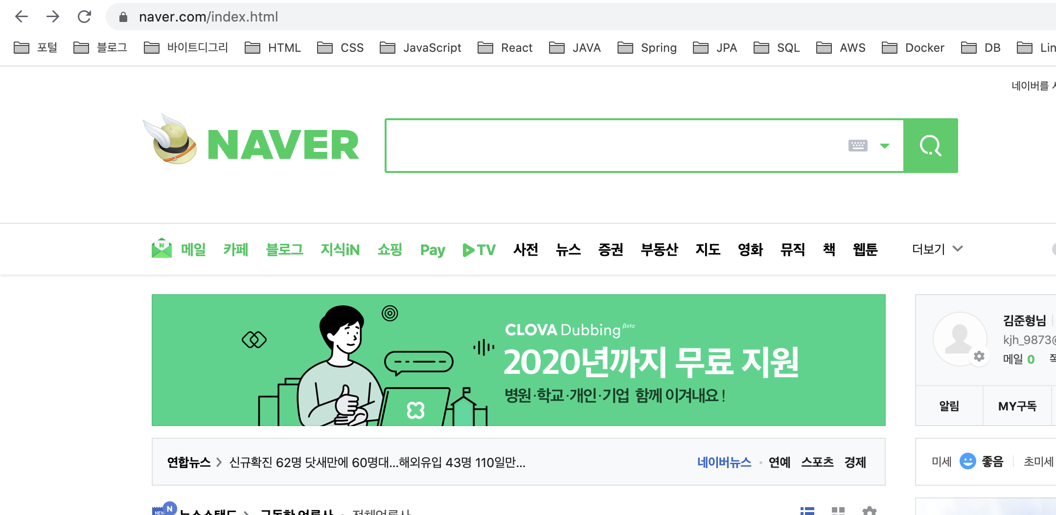 index.html로 접근한 naver 만약 index.html을 입력하지 않았으면 자동으로 index.html을 찾아주기 때문에 평소에는 index.html을 입력하지 않아도 위 화면이 보여지는 것입니다.